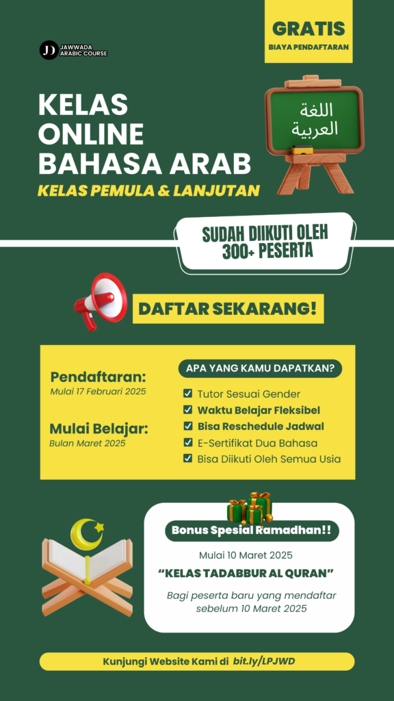 Cara mendaftarnya adalah melalui link WA yang sudah disediakan dengan mengklik tombol “bismillah, siap belajar” atau link yang ada di bio instagram @jawwada.arabic.